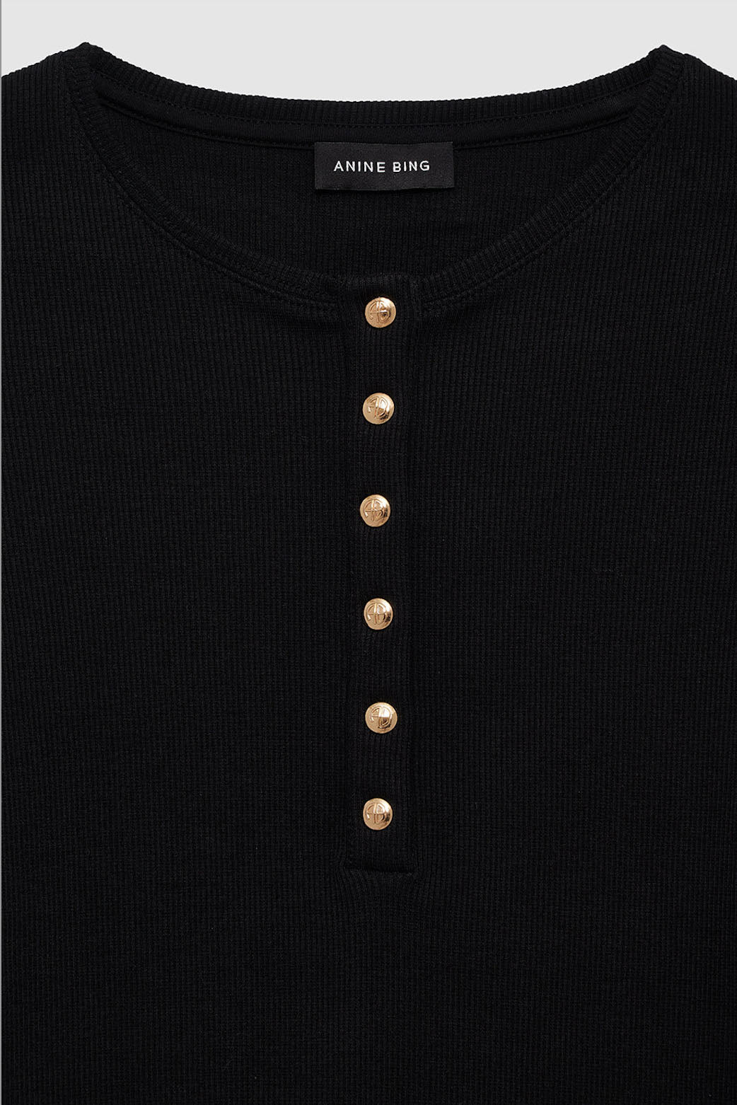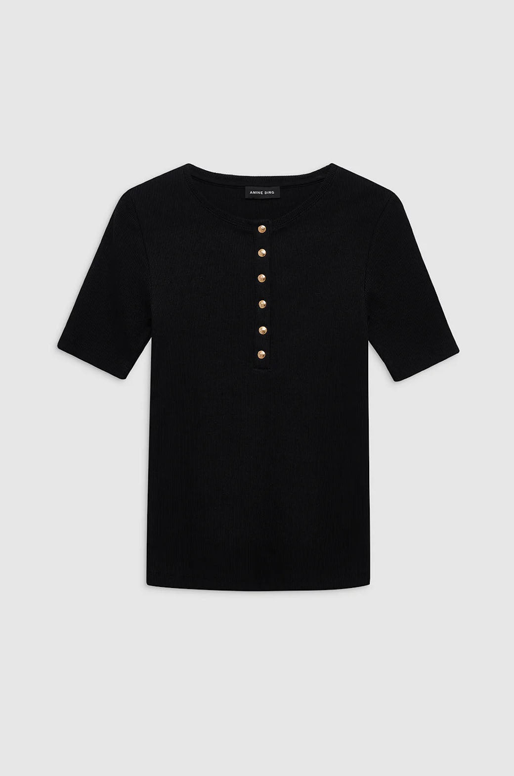 A modern, Henley-inspired tee made from a dense cotton-spandex blend with an all-over ribbed texture and a soft hand. This elevated basic features a high crew neckline and gold monogram snap buttons along the front placket.